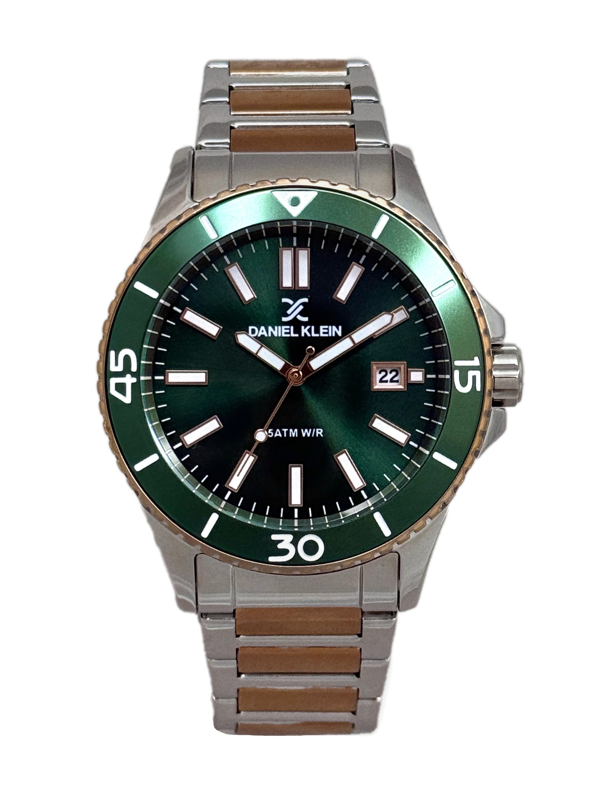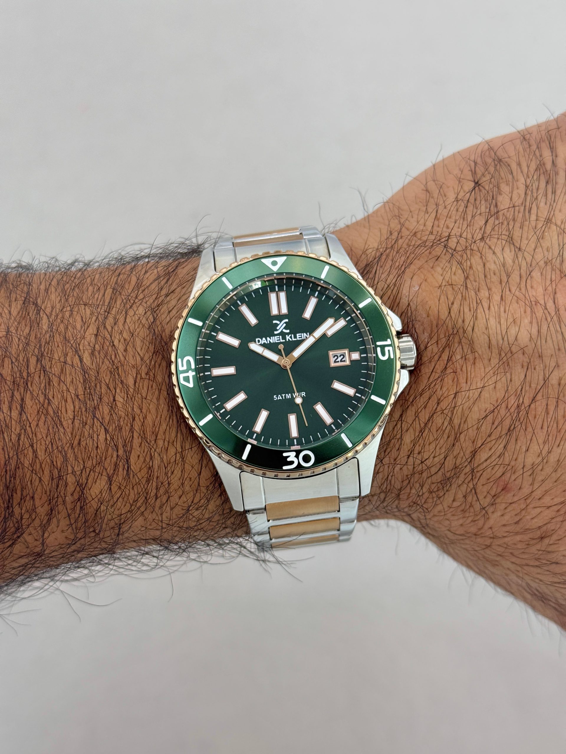 ساعت مچی مردانه دنیل کلین مدل DK.1.13694-5 با ترکیب رنگ جذاب سبز، سیلور و رزگلد، انتخابیه متفاوت برای آقایونی که استایل کلاسیک رو با یه حس مدرن میخوان. صفحه سبز در کنار قاب و بند استیل سیلور رزگلد، جلوهای شیک و چشمگیر ساخته که هم توی استفاده روزمره جواب میده هم برای موقعیت های رسمی کاملاً مناسبه. قطر صفحه ۴۳ میلیمتر و ضخامت ۱۰ میلیمتر باعث میشه ساعت روی دست متعادل و خوشفرم دیده بشه. موتور کوارتز میوتای ژاپنی دقت و دوام خوبی داره و شیشه کریستالی ضد خش، بدنه قاب سوپر متال و عقربههای شبتاب، کیفیت و کارایی این مدل رو کامل میکنن. این ساعت اورجینال با اصالت ترکیه و یک سال گارانتی موتور شرکت دنیل کلین عرضه میشه.