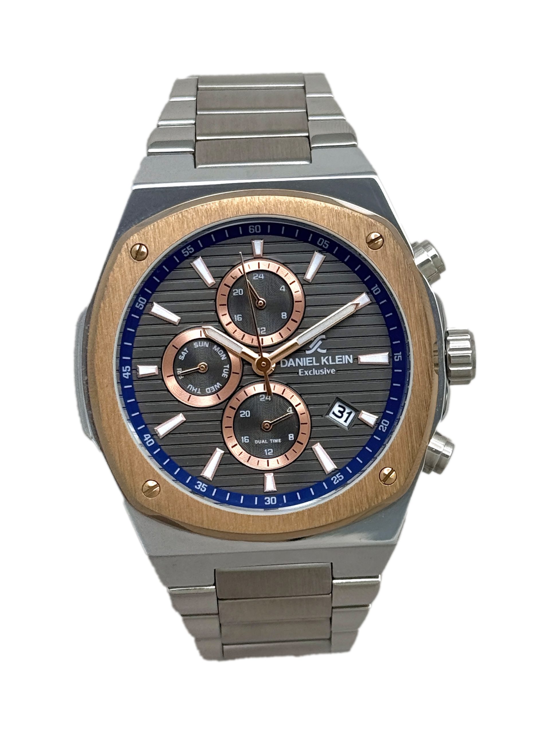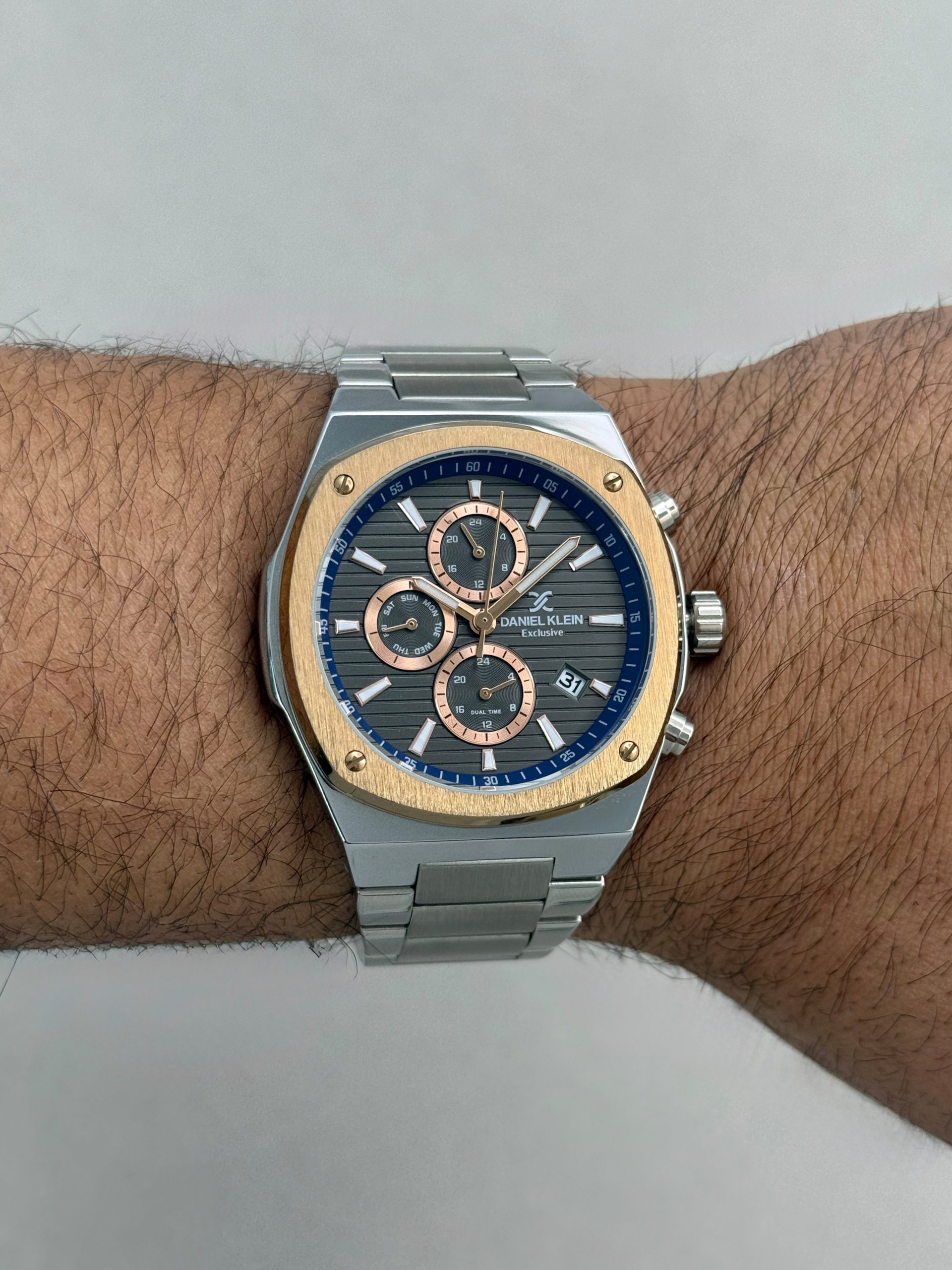 ساعت مچی مردانه دنیل کلین مدل DK.1.13413-4 از اون ساعتهاییه که هم سنگین و باوقاره، هم به چشم میاد. صفحه با ترکیب طوسی، آبی و رزگلد حس خاصی داره؛ نه شلوغه، نه معمولی. کنار بند و قاب سیلور–رزگلد، یه جلوهی کلاسیکِ مدرن ساخته که هم با کتوشلوار میشینه هم با استایل روزمره. قطر ۴۴ میلیمتر و وزن ۱۶۵ گرم باعث میشه روی دست محکم و خوشفرم دیده بشه. امکاناتی مثل نمایش تاریخ روز و هفته، نشانگر شبانهروز و دوئلتایم هم عملاً کار راهاندازه. موتور کوارتز میوتای ژاپن دقیق و بیدردسره، شیشه کریستالی ضدخش و قاب سوپرمتال هم دوام ساعت رو بالا برده. این مدل اورجینال با اصالت ترکیه و یک سال گارانتی موتور دنیل کلین عرضه میشه.